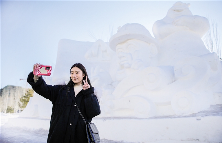 1月6日,首府市民在大型雪雕前拍照留念。当日记者在呼和浩特市海拉尔东街与科尔沁快速路交会处西侧路段看到,在道路南北两侧新建了3处大型雪雕,吸引众多市民驻足观赏。据呼和浩特市园林服务中心第三苗圃工作人员刘恺介绍,这3座雪雕建造历时一个月,其中最大的雪雕宽20米,高7米。 摄影/北方新报正北方网记者 牛天甲