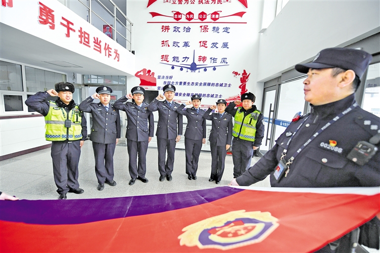 1月10日,自治区公安厅机场公安局呼和浩特机场公安分局值班民警正在重温入警誓词。当日是首个中国人民警察节,该局民警依然坚守岗位,以他们特有的方式,向警察节致敬,同时祝福所有奋战在一线的公安战友们,警察节快乐。(相关报道见4版)