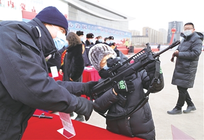 一名市民在民警指导下体验警用枪械。1月10日是全国首个“中国人民警察节”,也是第35个“110主题宣传日”,呼和浩特市公安局围绕“一心为民110 砥砺奋进新征程”主题,开展了文艺演出、服务宣传咨询、报警知识宣传、警用装备展示等形式多样的庆祝活动。