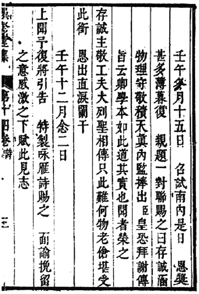 这一道诏书,历史上称作《宣谕云贵等处官民敕》,实际作者是当时翰林院的掌院学士熊赐履。正是他引导康熙帝躬行儒学,集中解决老百姓的生计问题,后来又被选中辅导皇太子,可见康熙帝对他的器重之深。他的《澡修堂集》里,有一首诗曰:“存诚主敬工夫大,列圣相传只此难。何物老伧堪受此,衔恩出直泪阑干。”就是康熙帝赐予他一副对联,圣恩浩荡,让他这个“老伧”感动得涕泪交流,因此而作了这首诗的。