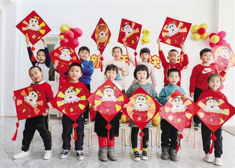 1月15日,呼和浩特市星辰幼儿园的孩子们在老师的指导下手绘“金牛”,送出充满童真的祝福。日前,北方新报正北方网联合阿里巴巴天天正能量发出“2021,让幸福来敲门”暖心公益行动倡议,盼望社会各界在春节前后走近身边的防疫医护人员和志愿者、特殊家庭、孤寡老人、春节值班无法回家的基层工作者等,为他们圆一个心愿,送一份温暖。星辰幼儿园的孩子们积极响应本次公益活动,亲手绘制“金牛”希望能够为基层工作者们送上一份温暖。摄影/北方新报正北方网记者 牛天甲