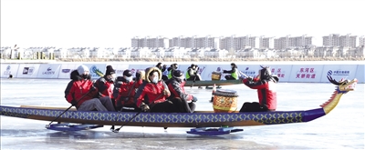 1月16日,包头市全民健身冰雪系列活动之一——冰上龙舟表演赛在南海湿地风景区举行,来自包头市的20支代表队180名运动员参加了比赛。在百米赛道上,鼓声阵阵,运动员们团结一心,奋力滑动龙舟,在冰面上一展速度与激情。经过激烈角逐,东河区天骄街道办事处代表队最终夺冠。