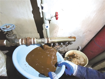 随后,城发供热金桥热网分公司运营五所工作人员对金先生家中的暖气管进行了查看,发现进水和回水管温差较大,初步认为供热管道有淤堵地方。按照工作人员的排查方法,他们打开了楼道管网井查看供热管道,发现管道内有过水声,管网中有大量气压,工作人员小心翼翼进行排压,几分钟后,管道内水流开始向外涌出,刚开始流出的是清水,往后则流出了浑浊的泥水,泥水中掺杂着管道铁渣和泥土,工作人员说:“管道内出现了严重淤堵,流出的水全部是暖气管道中的淤堵物,管道无法循环,这就是暖气不热的症结所在。”现场,工作人员放出5桶浑浊的泥水,随后管道内流出了清水。工作人员说,管道已开始正常循环。