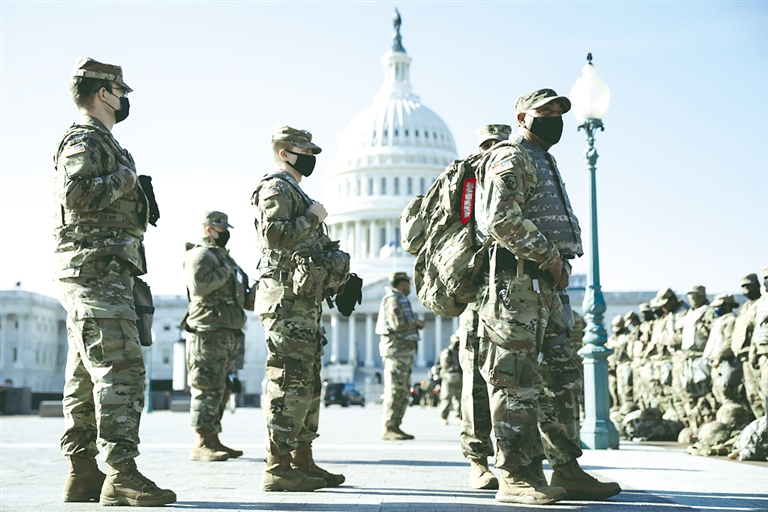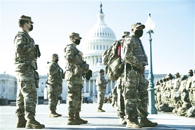 这是1月15日在美国首都华盛顿特区的国会区域拍摄的美国国民警卫队士兵。近日,白宫已授权美国国土安全部和联邦紧急措施署“调动和提供必要设备和资源”,协调并帮助就职典礼前后的安保工作。美国国会山骚乱事件发生后,定于1月20日举行的美国当选总统就职典礼的安全问题引发联邦和地方当局担忧。美国总统特朗普11日宣布,首都华盛顿特区进入紧急状态。据悉,就职典礼举行前,预计将有至少一万名国民警卫队队员被部署到这里。
