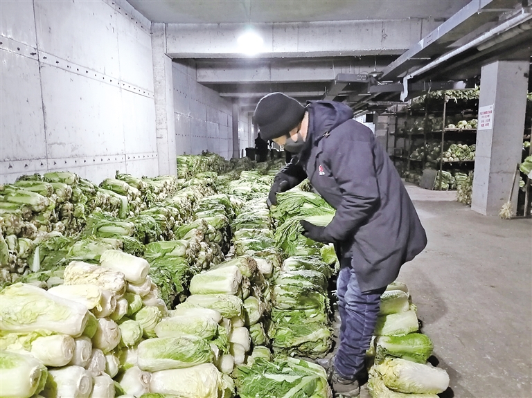 美通农产品批发市场内有很多冷库用来存储肉类、蔬菜、水果等需要低温保存的食品,其中一座占地2000多平方米的地下储备库里面堆满了大白菜,总重量为1000吨。当日,记者在冷库内看到,一棵棵大白菜整齐地摆放在货架上,库管吴利军正在对库里的大白菜进行挑拣。“每天都会做着重复的工作,不断将这些帮叶腐烂的菜叶剥去,还要对这些白菜进行翻个,以此来保持白菜的新鲜度。”吴利军说。