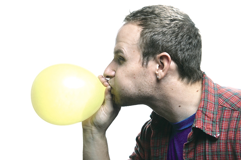 吹气球 取仰卧位,双脚抵墙,膝关节成90度,膝盖间夹住一个球;手拿气球,用鼻子吸气,持续3~4秒;嘴呼气,吹起气球,持续5~8秒,停顿2~3秒。重复6~8次。