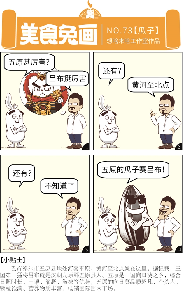 巴彦淖尔市五原县地处河套平原,黄河至北点就在这里,据记载,东汉末年名将吕布就是九原郡五原县人。五原是中国向日葵之乡,综合日照时长、土壤、灌溉、海拔等优势,五原的向日葵品质超凡,个头大、颗粒饱满、营养物质丰富,畅销国际国内市场。