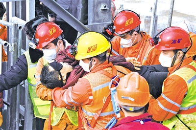 1月24日,一名被困矿工成功升井。当日,山东栖霞笏山金矿爆炸事故被困四中段和五中段的共11名矿工通过回风井成功升井。此前,位于五中段的1名被困矿工已确认无生命迹象。目前,仍有10人处于失联状态,救援人员将继续进行搜救。摄影/新华社记者 陈 灏