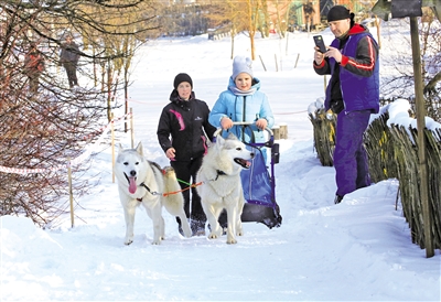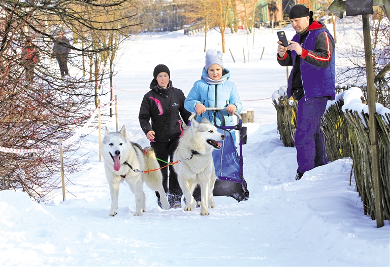 1月23日,在白俄罗斯首都明斯克动物园,一名儿童体验狗拉雪橇。当日,明斯克动物园专门为儿童举办体验狗拉雪橇的活动。摄影/任科夫