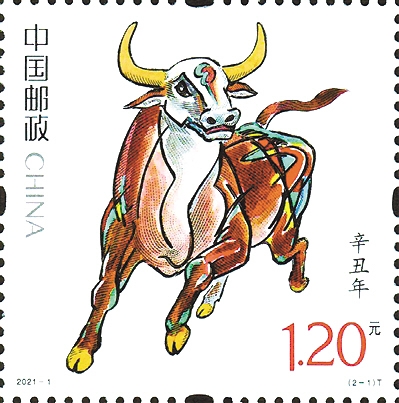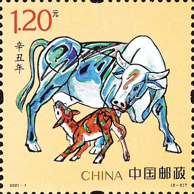 此前,1985年1月5日中国邮政发行第一轮生肖邮票中的“牛票”,即《乙丑年》特种邮票,全套1枚,图案是昂首站立的一头牛;1997年1月5日发行第二轮生肖邮票中的“牛票”,即《丁丑年》特种邮票,全套2枚。第一枚“金牛奋蹄”,图案是昂首向上的一头剪纸花牛。第二枚“牛耕年丰”,图案是一盏宫灯上书一隶书“牛”字;2009年1月5日发行第三轮生肖邮票中的“牛票”,即《己丑年》特种邮票,全套1枚,图案是向前奔跑的一头装饰画牛。另外,2005年11月6日发行的《岁岁平安》个性化服务专用邮票,主票图案为陕北民间艺人杨喜仙的剪纸《十二生肖万古传》,画面上边中间圆内一吹笛子的牧童骑着一头牛;2020年11月5日发行的2021年贺年专用邮票第一枚《国裕家康》,图案为美术大师韩美林先生采用传统中国画技法绘成的一幅水墨画牛。这枚贺年“牛票”与《辛丑年》生肖“牛票”有异曲同工之妙。