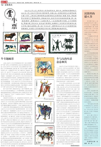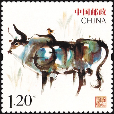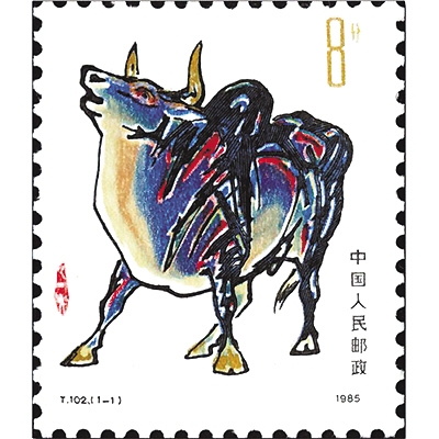 牛与人的生活息息相关,从古至今都是绘画、雕塑、工艺品以及玩具所表现的对象,1963年12月10日发行的《民间玩具》特种邮票第二枚“春牛(泥·上海)”,图案是上海民间泥塑玩具牛;1982年12月25日发行的《西周青铜器》特种邮票第四枚“牛首夔龙纹鼎”,图案为1979年在陕西省淳化一座西周墓葬中出土的青铜器,鼎上铸有牛头;1988年5月25日发行的《敦煌壁画(第二组)》特种邮票第三枚“北周·农耕”,图案出自敦煌莫高窟第296窟,是牛拉犁耕田的壁画;1989年9月1日发行的《当代美术作品(一)》特种邮票第三枚“吴作人《齐奋进》”,图案是著名国画大师吴作人先生笔下奋力向前的两头牛;1998年9月23日发行的《贺兰山岩画》特种邮票第三枚“公牛”,图案是古人画在岩石上的一头牛;1999年3月16日发行的《汉画像石》特种邮票第一枚“牛耕图”,图案是两头犁地的牛;2007年3月26日发行的《李可染作品选》特种邮票第五枚“浅塘渡牛图”,图案中池塘里有两头水牛。此外,1994年12月10日发行的《经济特区》特种邮票第一枚“深圳”、2000年8月26日发行的《深圳经济特区建设》特种邮票全套5枚、2010年12月12日发行的《中国资本市场》特种邮票第一枚“发展资本市场”、2018年5月19日发行的一枚《伟大历程》个性化服务专用邮票和2018年12月18日发行的《改革开放四十周年》纪念邮票第一枚“高举旗帜”等邮票中都出现著名雕塑家潘鹤创作的象征深圳精神的大型雕塑——一头奋力向前的拓荒牛。