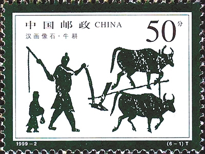 我国养牛历史悠久,牛一直是我们忠实的伙伴。在我国农业没有实现机械化之前,耕田犁地一直离不开牛。1952年1月1日发行的《土地革命》特种邮票,全套4枚同图,画面有一农民扶牛犁耕地;1952年3月15日发行的《和平解放西藏》纪念邮票第二、四枚“西藏农民用牦牛生产”,两枚同图,图案是藏族农民在用牦牛耕地的情景;1958年8月25日发行的《气象》特种邮票第一枚“古气象仪”,图案中有一牧童骑着牛;1960年1月20日发行的《全国农业展览馆》特种邮票第三枚“畜牧馆”图案中有一大一小母子牛;1961年11月25日发行的《西藏人民的新生》特种邮票第一枚“翻身曲”,图案中在行走的人群前有一头牛;1987年6月25日发行的《今日农村》特种邮票第三枚“喂牛”,图案中的牛棚里有3头牛;1997年1月1日发行的《中国首次农业普查》纪念邮票,图案中出现两头牛;1998年7月24日发行的《锡林郭勒草原》特种邮票第二枚“草甸草原”,图案中草原上有放牧的群牛;2006年7月1日发行的《青藏铁路通车纪念》邮票第二枚“翻越唐古拉山”,图案上有一群牦牛;2010年8月16日发行的《牛郎织女》特种邮票第二枚“男耕女织”,图案是牛郎扶着牛犁耕地画面;2015年2月4日发行的《二十四节气(一)》特种邮票第三枚“惊蛰”,图案中有两头牛在耕地,第四枚“春分”,图案中一儿童在原野上牧牛;2015年11月29日发行的《图说我们的价值观》特种邮票第二枚“中国梦·牛精神”,图案是套着犁鞍正在奋力耕地的一头牛。我国古代除用牛耕地外,还将牛作为交通工具,用牛拉车。1953年9月1日发行的《伟大的祖国(第三组)敦煌壁画》特种邮票第四枚“牛车·唐”,图案是一头牛拉着篷车。