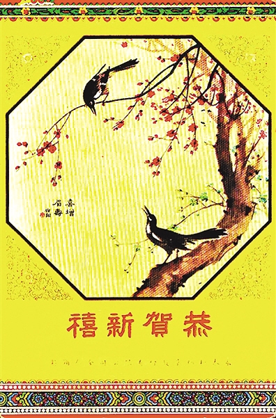 第一张贺卡是上海永泰和烟草股份有限公司为庆贺1936年新春特别印制的。贺卡主色调为明黄色,正八边形的图框内是一幅“喜增眉寿”图,出自名噪一时的海派名家胡伯翔的手笔。红梅报春,喜上眉梢,天增岁月人增寿。红梅和喜鹊是传统国画中常见的素材,也是中国人民喜闻乐见的春天象征。红梅芬芳,喜鹊乖巧,一静一动,烘托出浓郁的新春气象。贺卡的边缘是富有民族特色的花纹图饰。主图的下方是红色的“恭贺新禧”四个大字,以及“永泰和烟草股份有限公司全人鞠躬”等文字,表明了这张贺卡的赠送者。历时80余年,贺卡依旧色泽鲜艳,非常喜庆。