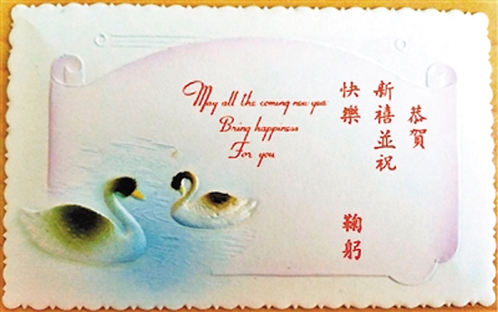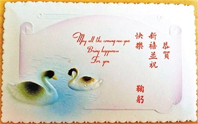 第二张贺卡发行于上世纪四十年代。这是一张单页式个人贺卡,大致呈长方形,长约9.5厘米,宽6厘米。贺卡采用凹凸版印刷,边缘选用了当时贺卡上少见的波浪纹饰,显得活泼灵动。凸雕的主画面是中国书画卷轴式设计,一大一小两只天鹅在水中悠闲地游来游去,水波荡漾,洋溢出一圈圈新春的气息。天鹅黑冠白羽,体态优雅,仿若天使一般,为人间带来无限吉祥。画面的右侧繁体印刷的“恭贺新禧 并祝快乐”的红色字样,落款处有“鞠躬”二字,前面可以添加恭贺人姓名。更值得一提的是这张贺卡还有英文版的贺词,画面飘逸,贺词隽永,让整张贺卡变得更加富于情趣。