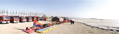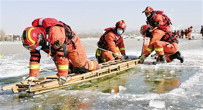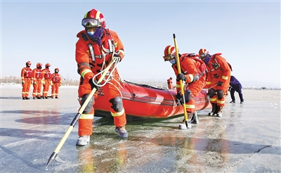 1月26日,包头市消防救援支队联合内蒙古蓝天救援队在南海湿地保护区的冰冻湖面上开展了“低温雨雪冰冻灾害事故实战拉动演练”,他们冒着严寒,在冰面上匍匐前进,全力解救冰窟中的“被困人员”。