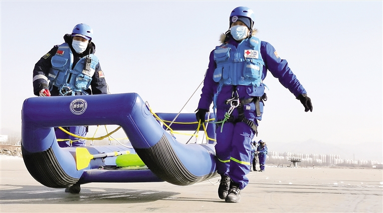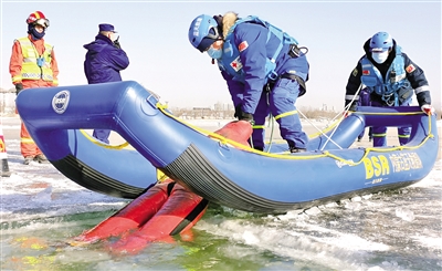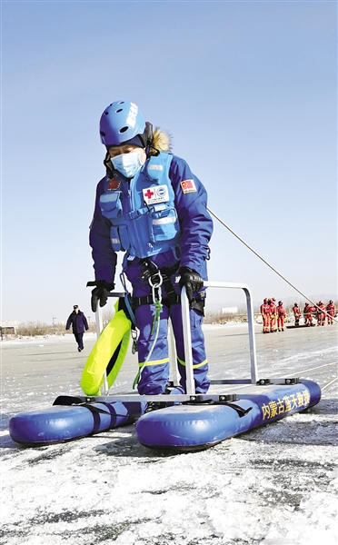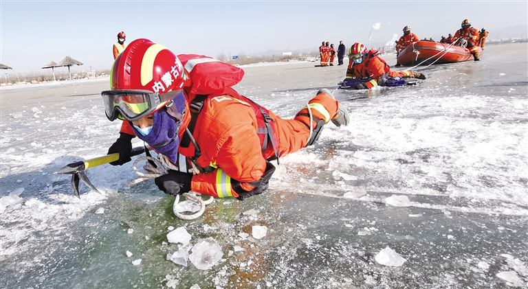 内蒙古蓝天救援队队长李海峰告诉记者,通过此次演练,极大地提高了队员们冰上救援的能力。
