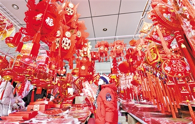 1月27日,市民在和平里一处市场选购春节装饰品。春节临近,北京市民纷纷采购灯笼、春联、年画等装饰品,准备红红火火过春节。摄影/新华社记者 李 欣