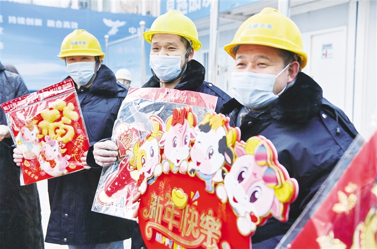 1月30日,中建三局呼和浩特市第十四中学校舍改造重建项目部的工友们手持慰问品开心留念。当日,呼和浩特市新城区人社局、总工会、劳动监察大队赴该项目部开展2021年春节“送温暖”慰问活动,为就地过年的工友们发放了130件棉大衣,同时送上了春联、口罩等慰问品。 摄影/北方新报正北方网记者 王利军