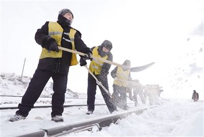1月29日,中国铁路呼和浩特局集团有限公司锡林浩特综合维修段职工清理铁路线上的积雪。入冬以来,锡林郭勒草原持续遭遇寒潮风雪天气。为保障铁路运输畅通,中国铁路呼和浩特局集团有限公司锡林浩特综合维修段组织清雪队伍,每日对风口地段进行巡视检查,及时清理线路积雪,确保春运行车安全。