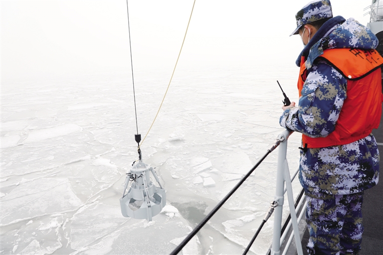 1月25日,海冰722号破冰船在辽东湾海域进行海冰取样。海军破冰船1月31日上午完成第84次黄渤海冰情调查任务,顺利返港。摄影/孙 昊