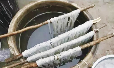 压粉时,用它来支起木制的饸饹床,撑重稳当。粉面趁热和好还需趁热压,通常是力气大的男人们来负责。细圆或宽扁的粉条缓缓落入热气翻滚的开水锅里,不一会,晶莹亮白、光滑剔透