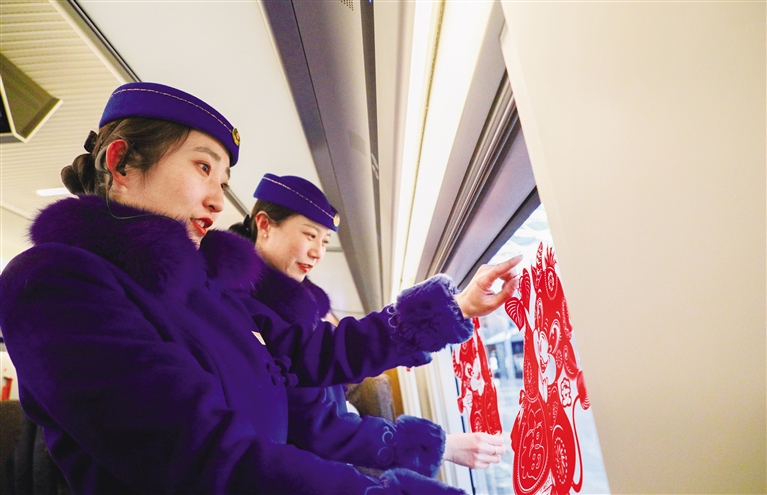 2月3日,乘务员在G2482次列车上张贴窗花。2月4日是农历的小年,中国铁路呼和浩特局包头客运段高铁车队在开往北京北的复兴号动车组列车内,贴上喜庆的窗花,给旅客们送上浓浓的年味。