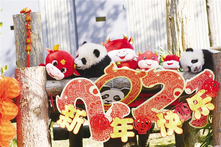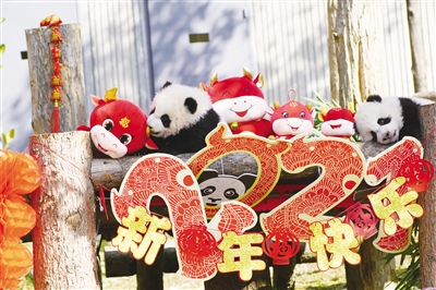 2月3日,两只大熊猫宝宝在玩耍。当日,中国大熊猫保护研究中心10只2020年出生的大熊猫宝宝集体亮相四川卧龙神树坪基地,向全国人民送上新春祝福。