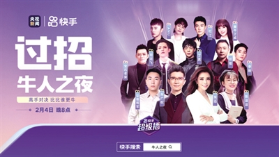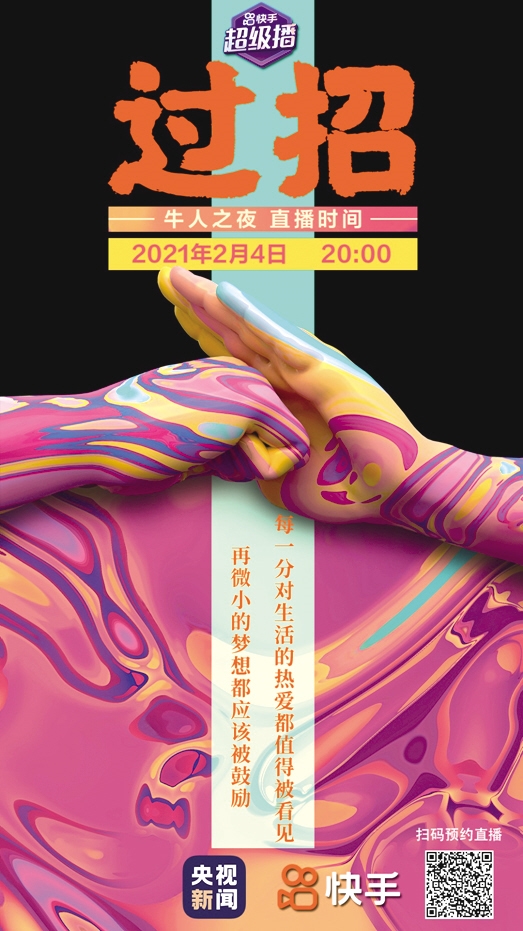 2月4日农历小年夜,由快手联合央视打造的春节特别节目——“过招”牛人之夜晚会,于当天晚上8点在央视新闻快手号直播。众多明星和快手达人同台献艺,为即将到来的2021年牛年春节,带来一场不一样的精彩体验。