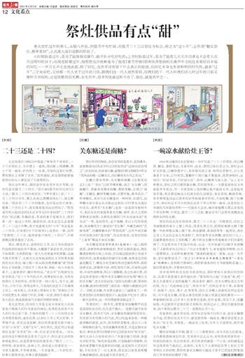 祭灶这件事儿,据民俗学家金受申先生考据,在宋代是在腊月二十四日。“范石湖《腊月村田乐府引》上说:‘腊月二十四日夜祀灶。’《梦华录》上说:‘十二月二十四日交年,都人至夜以酒糟涂抹灶门,谓之醉司命。’现在用二十三日的缘故,也许是应在后夜祭,便算二十四日上午,真实缘故是没法证明的了。”而笔者在明人陆启浤的《北京岁华记》中亦找到“二十四日祀灶”的记载。有趣的是,笔者的妻子是南方人,我们第一次一起过小年时,她很惊讶,说北京怎么会是腊月二十三过小年啊,我才知道南方的“小年”多还是在二十四日,后来看《日下旧闻考》上说祭灶一事,京师“祀期用二十三日,惟南省客户则用二十四日”,不禁感慨这便真是存了古风。