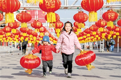 2月6日,小朋友们在呼和浩特市玉泉区大召步行街红灯笼下玩耍。随着春节临近,首府各景区、广场、步行街挂起了火红的灯笼,浓浓的年味儿弥漫开来,耀眼的“中国红”映红了千家万户的喜悦。