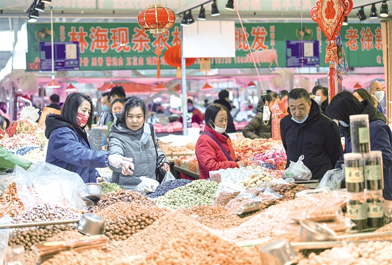 2月7日,首府市民在保全庄农贸市场购买年货。记者当日在呼和浩特市一些商场超市看到,各类特色年货琳琅满目,前来采购年货的市民络绎不绝,年货销售迎来高峰。