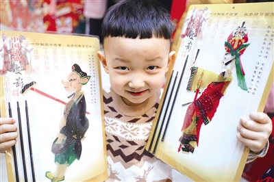 2月8日,一名小朋友在迁安市“非遗年味市集”上展示刚刚购买的皮影。为迎接新春佳节,河北省迁安市近期举办了“非遗年味市集”,汇聚皮影、吹糖人、糖画、捏面人等丰富多彩的非遗文化项目和民俗文化展示,让市民感受传统文化魅力和极具特色的“年味大餐”。