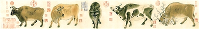 画牛的传世名作当属唐代画家韩滉的《五牛图》最为著名,可谓旷世之品,具有很高的艺术水准。元代画家赵孟頫称赞说:“五牛神气磊落,稀世名笔也。”作为政治家和画家的韩滉托物言志,其中渗透着作者鲜明的品德追求和关注农耕的殷切情怀。