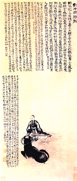 石涛是中国绘画史上一位十分重要的人物,综观其一生绘画作品,无论是寻丈巨制,还是尺页小品,都具有十分鲜明的个性和时代气息,观之令人难以忘怀。尤其是晚年,石涛的绘画艺术达到了炉火纯青之高峰。《对牛弹琴图》正是石涛晚年的重要作品,画面简约,仅一士、一琴、一牛而已。一高士正面而坐,目视前方,神情静穆,手抚琴弦;一玄牛面向高士而卧,全神贯注,侧耳倾听,如痴似醉。背景空旷,似琴声萦绕其上,余音袅袅。水墨绘就,浓淡相间,不着一色,笔墨洗练,构图奇险,大片的留白,给人以想象的空间。其上题跋和诗占据了大量版面,其中石涛和曹寅诗云:“牛声一呼真妙解,牛角岂无书卷在。世言不可污牛口,琴声如何动牛慨。此时一扫不复弹,玄牛大笑有谁尔。牛也不屑学人语,默默无闻大涤子。”和杨耑木诗云:“朝耕暮犊不知音,一弹弹入墨牛耳。牛便倾心寐破云,琴无声兮犹有闻。世上琴声尽说假,不如此牛听得真。听真听假聚复散,琴声如暮牛如旦。牛叫知音切莫弹,此调一曲琴先烂。”读石涛的和诗,让人感觉到此画的 “言外之意”“象外之象”。
