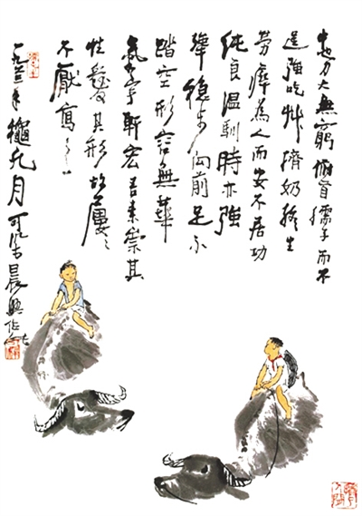 李可染多次在其《放牛图》上题跋:“牛也,力大无穷,俯首孺子而不逞强,吃草挤奶终生劳瘁,为人而安不居功。纯良温驯,时亦强犟,稳步向前,足不踏空,形容无华,气宇轩宏。吾素崇其性,爱其形,故屡屡不厌写之。”李可染十分喜欢牛,更喜欢画牛,为此他将画室命名为“师牛堂”,且自称“孺子牛”。从上世纪40年代开始,一直到生命结束,他留下了许多以牛为题材的精品力作。人们把李可染的牛、齐白石的虾、徐悲鸿的马和黄胄的驴,并称为“二十世纪中国水墨四绝”。