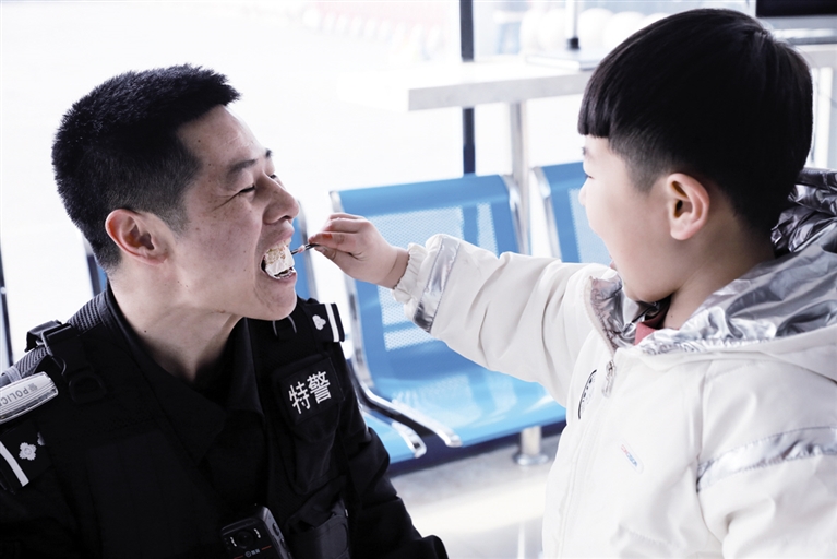 2月11日除夕夜,李国辉值班,周蔚则是刚下夜班,她独自在家包了饺子、做了几道菜,然后给在岗执勤的丈夫送去了一餐“爱心年夜饭”。4年来,周蔚和李国辉总是因为工作原因错过一起陪家人吃除夕团圆饭,但是他们无怨无悔,正如他们所说:“我们是铁警,春运期间,护航天南地北的旅客安全出行是我们最大的责任。”