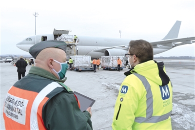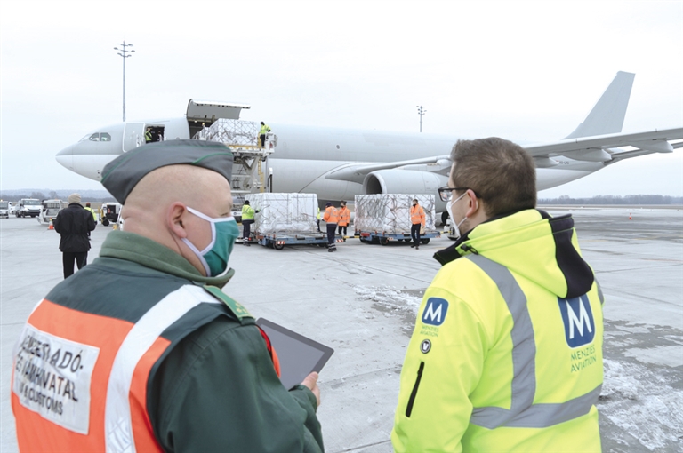 2月16日,在匈牙利首都布达佩斯,机场工作人员卸载中国出口匈牙利的首批新冠疫苗。中国出口匈牙利的首批新冠疫苗16日运抵布达佩斯。匈牙利首席医疗官米勒·塞西莉亚1月29日宣布,中国国药集团生产的新冠疫苗已获准在匈牙利使用。匈牙利政府随后宣布,已与中国国药集团签署购买疫苗的协议。(据新华社报道)