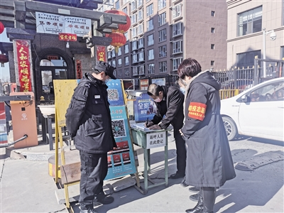 记者跟随工作人员来到辖区地新街坊小区,几名社区工作人员正在小区门口负责疫情防控,“您好!请问您去哪栋楼?请下车登记信息。谢谢!”“请居民佩戴好口罩”……针对出入小区的人员,社区工作人员都一一仔细核查,宣传防疫信息。“春节长假过后,很多事都堆到今天了,所以格外忙。”阿拉善北路社区党总支书记王海琼说,阿拉善北路社区很多网格员都放弃了与家人团聚的时间,主动下沉到各个小区开展疫情防控工作,实行24小时轮岗制,做好外地返呼人员登记和扫码工作,保证辖区防控安全。除此之外,还积极参与禁燃烟花爆竹、垃圾分类宣传等工作,让政策落到实处。
