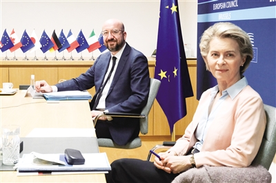 2月19日,在比利时布鲁塞尔的欧盟总部,欧洲理事会主席米歇尔(左)和欧盟委员会主席冯德莱恩出席七国集团领导人视频会议。七国集团领导人19日举行视频会议,重点商讨新冠疫苗研发与分配、疫后经济振兴等议题。七国集团表示将与世界卫生组织、二十国集团等多边组织一道,为加强全球卫生安全而合作。(据新华社报道)