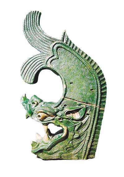 古代鸱吻的形象并非一成不变。南北朝时的“蚩尾”不上釉,尾身竖直、尾尖向内卷曲,外部又雕刻出鳍纹,很显然只突出怪兽的尾巴。晚唐以后,蚩尾逐渐演变成兽头形的鸱吻,材质也从裸陶变为釉陶。