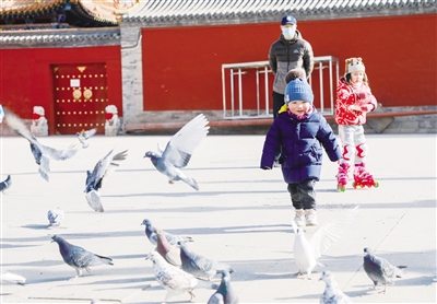 2月22日,小朋友在大召广场与鸽子嬉戏。连日来,呼和浩特气温回升,阳光明媚,众多市民走到户外,一边享受着春日暖阳,一边欣赏青城美景。 摄影/北方新报正北方网记者 牛天甲