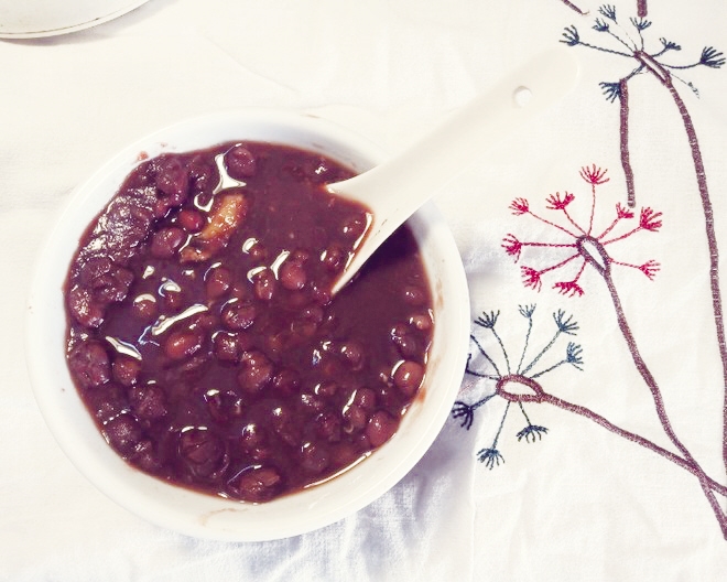 做法:红豆加入适量清水浸泡一夜。将红豆、红枣、姜片加水放入锅中,大火烧开后转小火慢炖两个小时,其间不时搅拌以免煳锅。在出锅前5分钟把冰糖和红糖加入锅中,稍加搅拌。