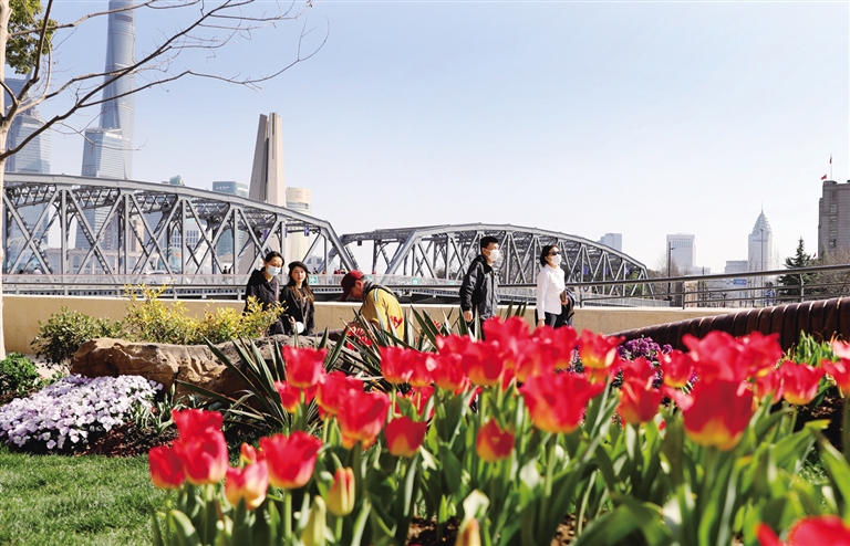 2月21日,人们在上海苏州河边漫步休闲。近日,上海地区气温回暖,众多市民游客来到户外,赏春花、沐暖阳,迎接春天的到来。摄影/新华社记者 方 喆