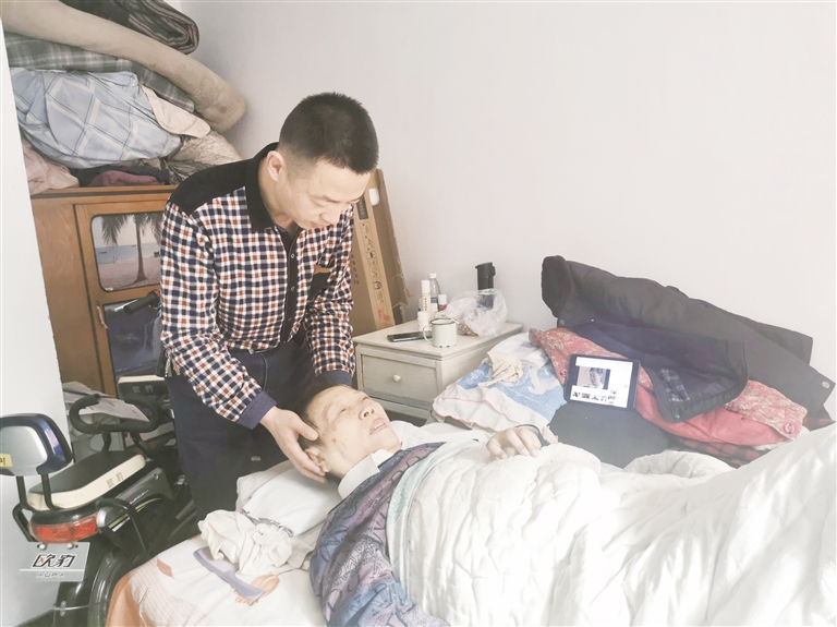 刘志新的妻子吴宏霞在一家旅游企业做销售,哪怕工作再忙再累,她每天回到家也总是乐乐呵呵的,做饭尽量就着婆婆的口味来,逢年过节总会给婆婆买身新衣服,剪个新发型。知道婆婆爱吃红薯,她隔三岔五就把红薯买好放在冰箱里。担心婆婆一个人寂寞,她只要一有空就陪婆婆聊天,还专门买了一台平板电脑,放在床上方便婆婆追剧……十年来,在夫妻两人的悉心照顾下,常年卧床的李进华从未长过褥疮。