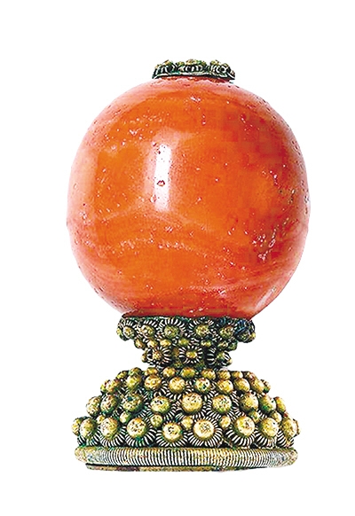 相比红宝石顶珠,红珊瑚顶珠的存世量较大,民间亦有收藏。2015年,一枚品相完好的红珊瑚顶珠在香港某拍卖行上拍,最终以3.8万元成交。该顶珠直径仅3厘米,就其体量而言,价格已然不菲。