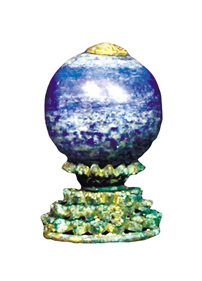 清代三品与四品官员间有一道分水岭,二者权力、待遇差距甚大,这点从其顶珠的材质可见一斑。青金石在中国古代亦为一般珠宝,有璆琳、金精、瑾瑜、青黛等别称。青金石经丝绸之路由阿富汗传入中国,其通常为集合体产出,呈致密块状、粒状结构,颜色为深蓝色、紫蓝色、天蓝色、蓝绿色等。此外,青金石还是古代天然蓝色颜料的来源之一。