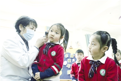 3月3日,在河北省邢台市襄都区第六幼儿园,河北省眼科医院医生为小朋友做检查。当日是全国爱耳日,各地开展宣传教育活动,增强人们的爱耳护耳意识。(据新华社)