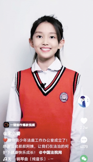 3月3日早上,拥有超1800万粉丝的快手小音乐人@宋小睿(ID:190367)发布了一则视频,对少年法庭办公室的成立点赞:“祖国的花朵,离不开法治的阳光雨露。少年法庭办公室是加强未成年人司法保护的专门机构,也是最高人民法院为我们少年儿童搭建的‘避风港’。感谢法官叔叔阿姨,让我们可以在法治的呵护下,更加健康快乐地成长!”