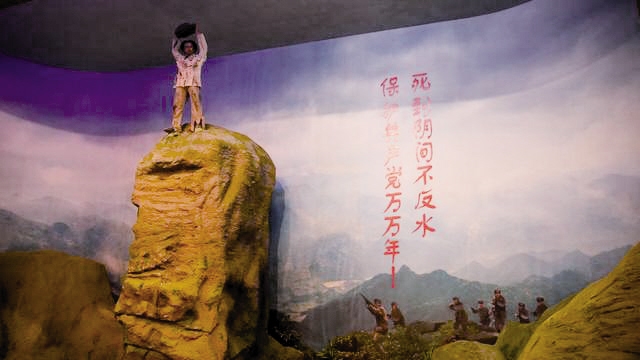 冬日,寒风凛冽。在那座峭拔的石峰上,江善忠昂首挺立在峰顶,而在石峰下,正是一群端着长枪的敌人。在被敌人包围后,他用鲜血在衬衫上写下“死到阴间不反水,保护共产党万万年”的誓词,纵身一跃……
