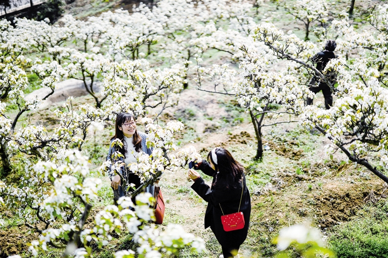 3月11日,游客在梨园中拍摄美景,尽情游玩。近日,重庆市渝北茨竹镇放牛坪景区的梨花在春风春雨滋润下竞相绽放,与散落其间的农舍相映,勾勒出一幅如诗画卷。近年来,茨竹镇“以梨为媒”积极推动乡村振兴,打造春看花、夏采果融合发展的乡村生态旅游业,当地村民实现人均年增收近万元。